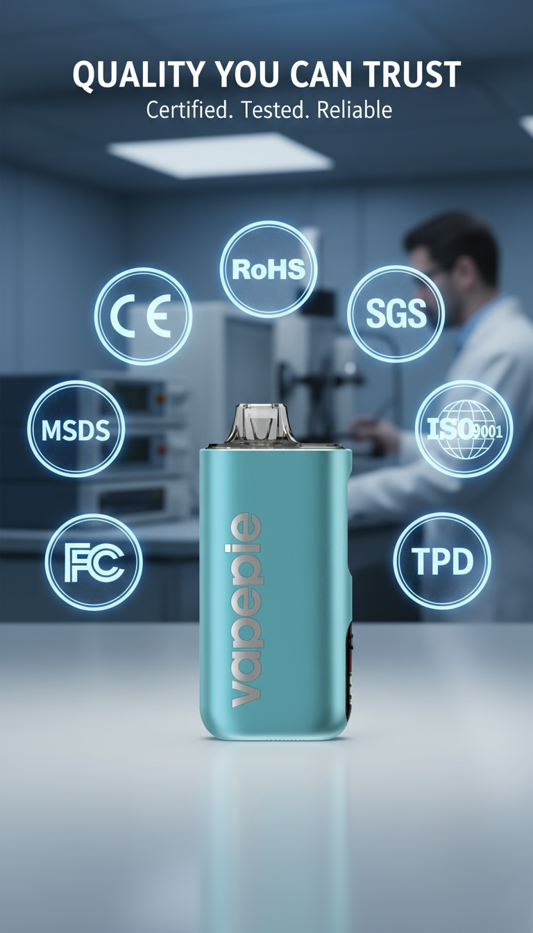 Every Vapepie product undergoes rigorous testing and international certification, including CE, RoHS, SGS, MSDS, and ISO 9001.